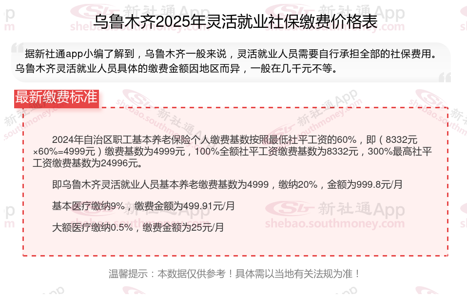 那么,乌鲁木齐灵活就业人员社保缴费基数最新标准,乌鲁木齐灵活就业社保多少钱一个月?根据新社通app-社保缴费查询工具提供的2025社保缴费标准详情数据: