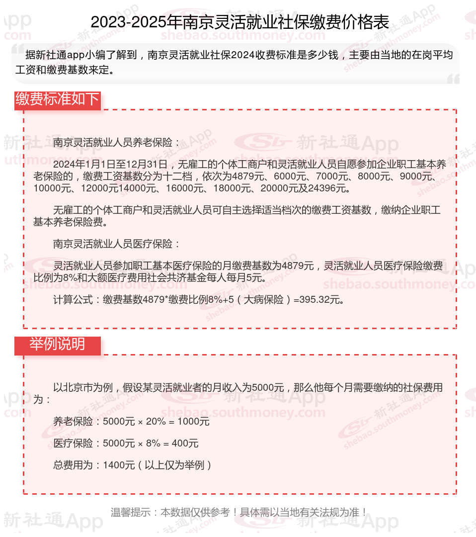 那么,南京灵活就业人员社保多少钱一个月?根据新社通app-社保缴费查询工具提供的2025社保缴费标准详情数据: