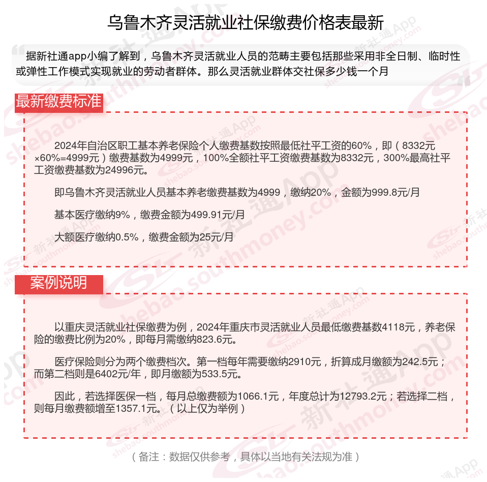 据新社通app数据显示,乌鲁木齐灵活就业养老保险缴费基数2024-2025年最新标准如下: