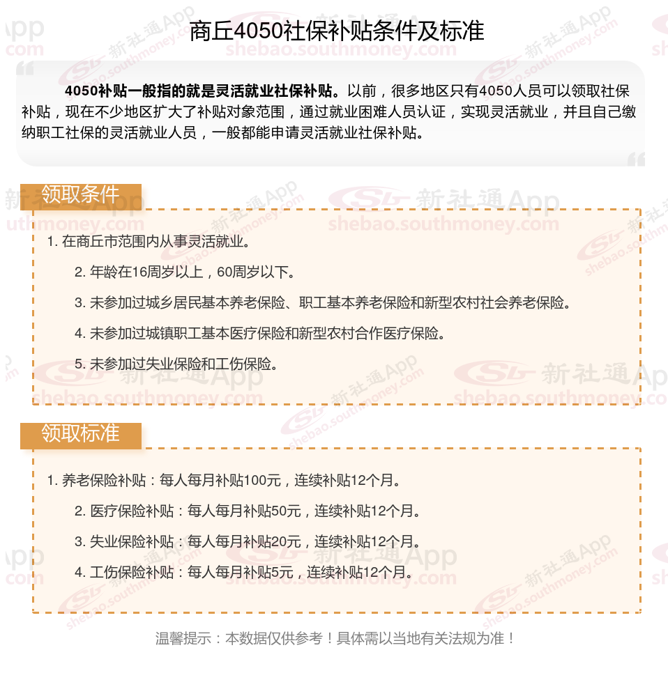 二、2025年商丘4050社保补贴标准及条件,最新如下: