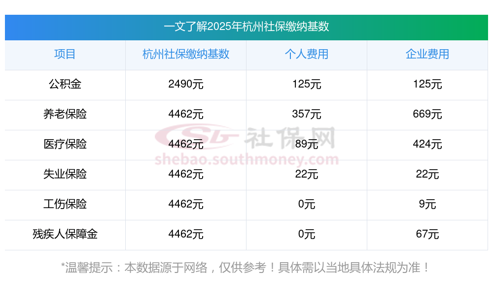 (1)据新社通小编了解到,确定社保缴费基数,以职工上一年度月平均工资为主要依据,结合当地社会平均工资60%-300%的上下限范围调整。 目前,杭州社保缴费基数为:4462.00,个人费用约为:356.96元,企业费用约为:669.3元。