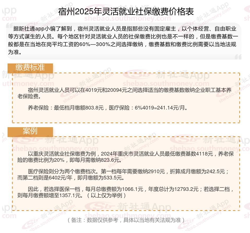 2025?年度宿州灵活就业社保缴费基数明细来了,灵活社保断交多久就作废了?根据新社通app-社保缴费查询工具提供的2025社保缴费标准详情数据: