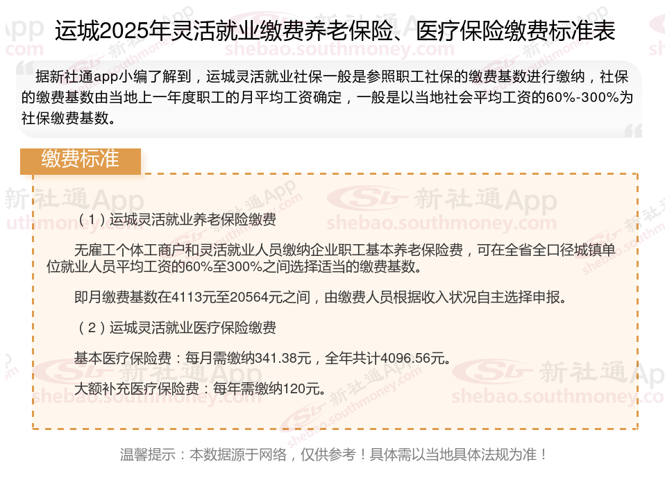 据新社通app数据显示,运城灵活就业养老保险缴费基数2024-2025年最新标准如下: