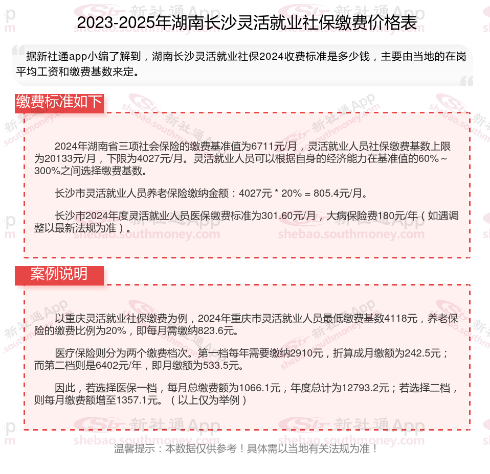 据新社通app数据显示,湖南长沙灵活就业养老保险缴费基数2024-2025年最新标准如下: