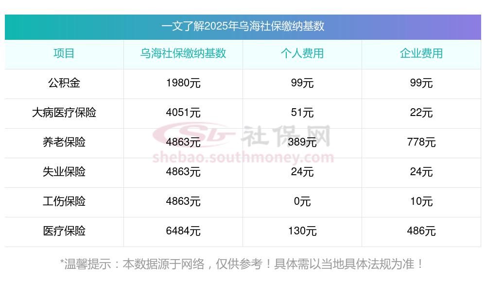 据新社通app-查阅了解到,把职工上一年1月至12月全部工资性收入所得进行月平均得到的月平均额,确定为社保基数,该基数用于计算缴纳社会保险费的工资基数。 目前该乌海社保的缴费基数为:4863.00,个人费用约为:389.04元,企业费用约为:778.08元。