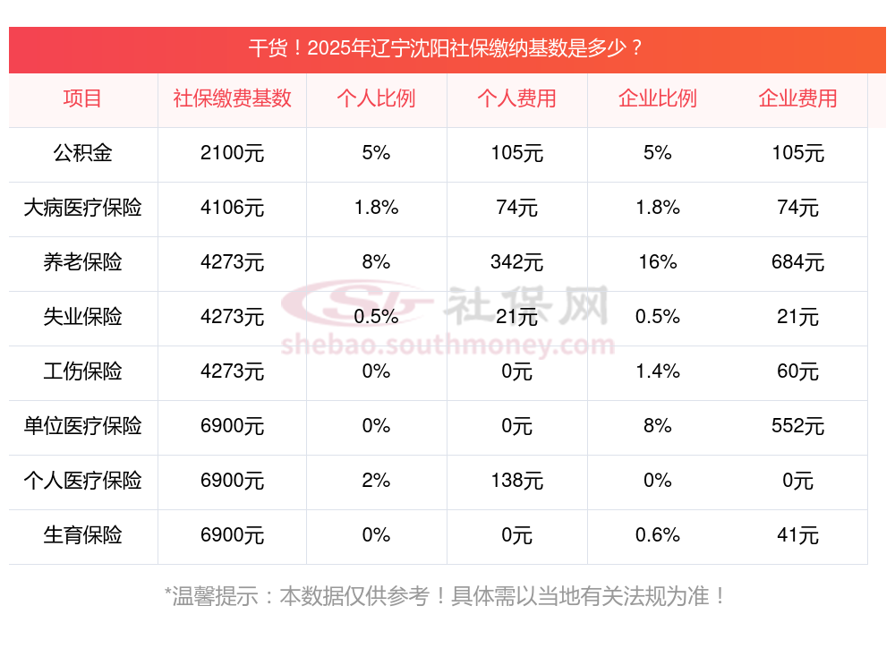 (1)据新社通小编了解到,社保缴费基数的确定,以职工上一年度月平均工资为主,结合当地社会平均工资60%至300%的上下限来完成调整。 目前,辽宁沈阳社保缴费基数为:4273.00,个人费用约为:341.84元,企业费用约为:683.68元。