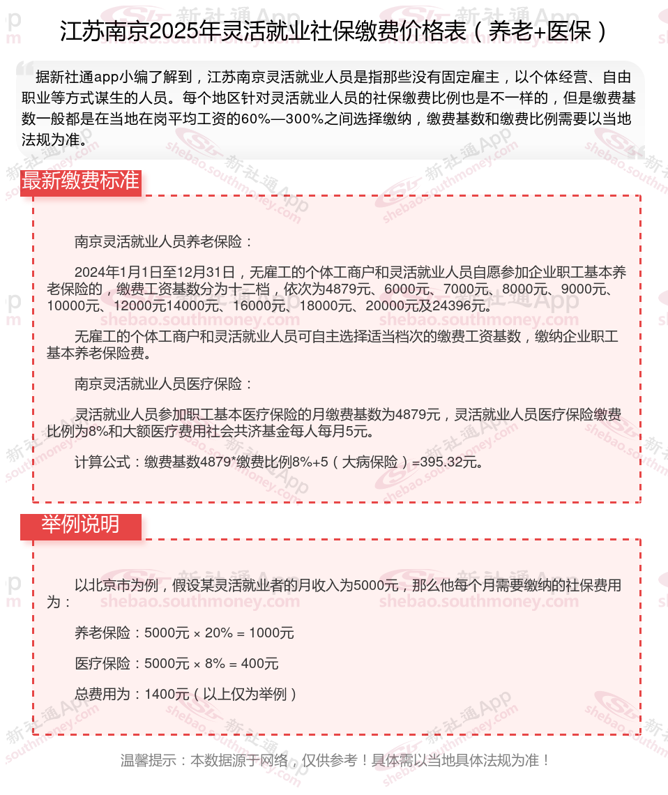2024-2025年江苏南京灵活就业人员社保缴费标准是多少?社保交完退休能领多少钱?下表是2024-2025年江苏南京社保费用明细参考,根据新社通app-社保缴费查询工具提供的最新数据如下: