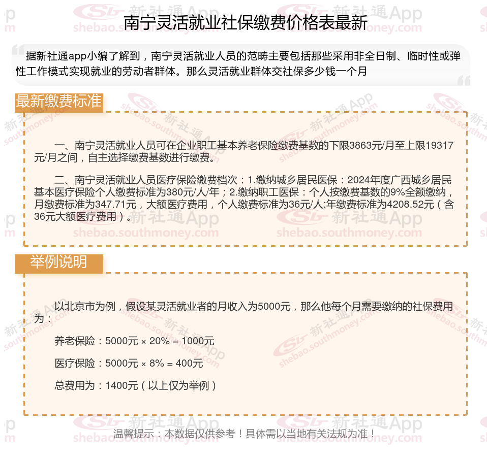 南宁灵活就业人员社保缴费最低标准是多少?灵活就业人员的社保缴费金额受到多种因素的影响,包括个人收入、缴费基数、缴费比例以及所在地区的具体方案。下面随新社通app小编一起了解详情吧。