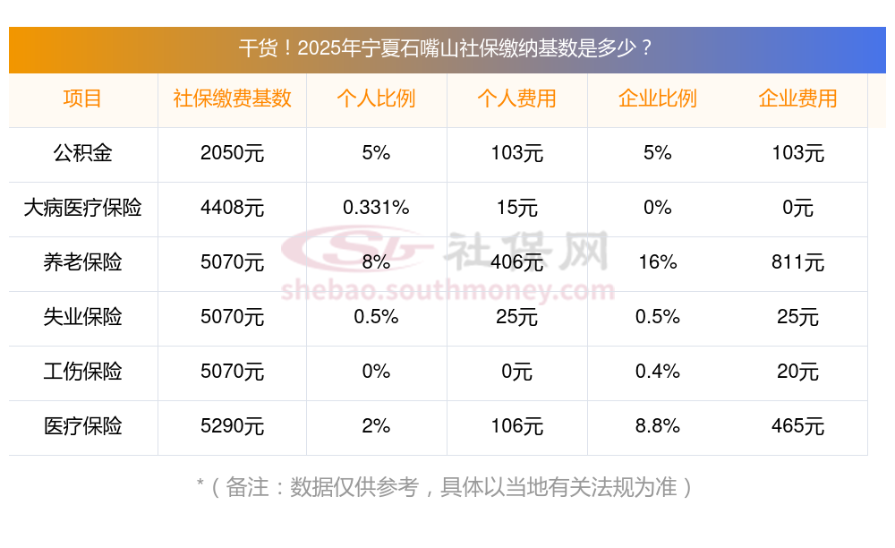 2025年宁夏石嘴山社保缴费标准个人交多少呢?据新社通小编了解到,社保缴费基数的确立,首先依赖职工上一年度月平均工资,然后根据当地社会平均工资60%-300%的上下限区间进行调整。 目前,宁夏石嘴山社保缴费基数为:5070.00,个人费用约为:405.6元,企业费用约为:811.2元。