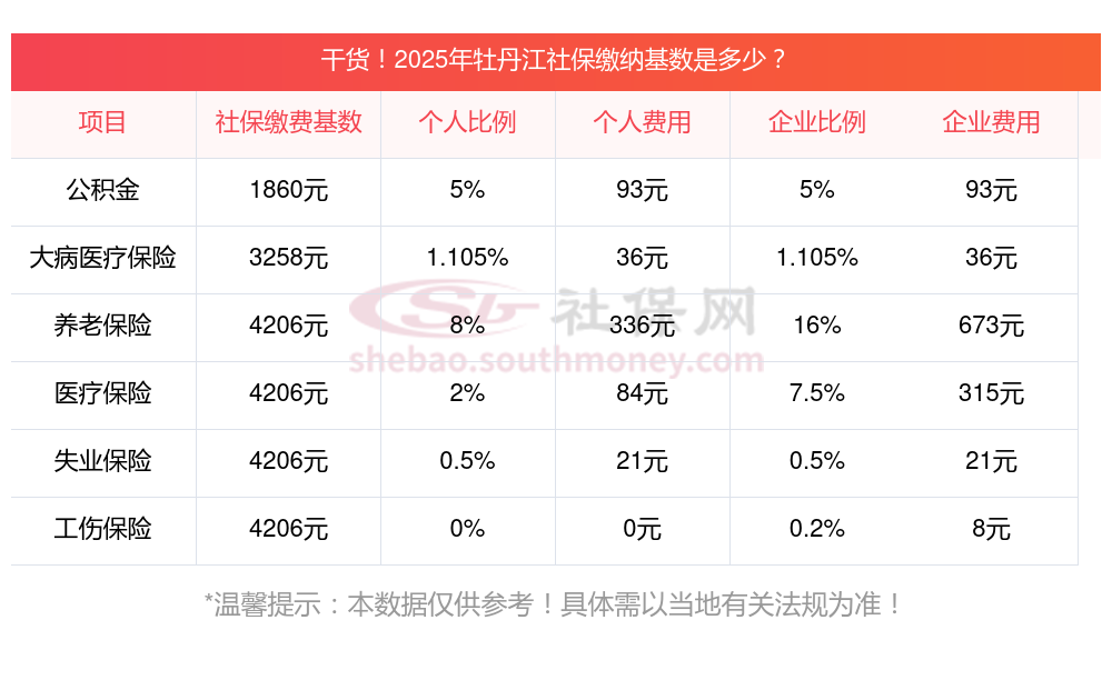 (1)据新社通小编了解到,职工上一年度月平均工资作为社保缴费基数确定的主要参考数据,再结合当地社会平均工资60%-300%的上下限来调整。 目前,牡丹江社保缴费基数为:4206.00,个人费用约为:336.48元,企业费用约为:672.96元。