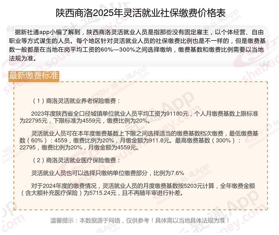 2024-2025年陕西商洛灵活就业人员社保缴费标准是多少?社保交完退休能领多少钱?下表是2024-2025年陕西商洛社保费用明细参考,根据新社通app-社保缴费查询工具提供的最新数据如下: