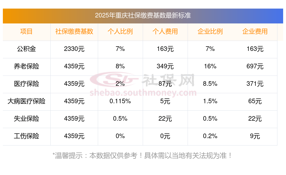 一、据新社通小编了解到,社保缴费基数的确定,先以职工上一年度月平均工资为依据,然后结合当地社会平均工资上下限(60%-300%)的范围进行调整。 目前,重庆社保缴费基数为:4359.00,个人费用约为:348.72元,企业费用约为:697.44元。
