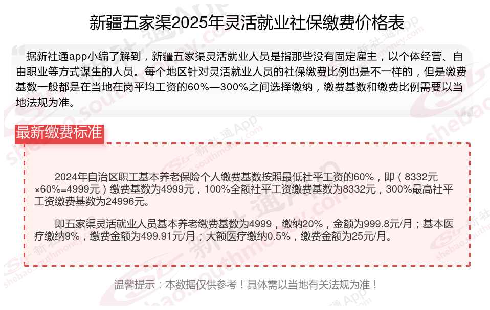 2025?年度新疆五家渠灵活就业社保缴费基数明细来了,灵活社保断交多久就作废了?根据新社通app-社保缴费查询工具提供的2025社保缴费标准详情数据: