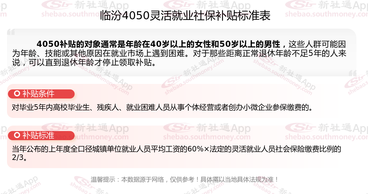 以上就是临汾4050灵活就业社保补贴的相关内容,欢迎关注新社通/下载新社通APP了解更多五险一金专业资讯。