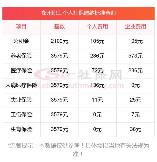 据新社通app小编了解到,2025年郑州社保缴费基数参照为3579.00,郑州社保缴费明细如下: