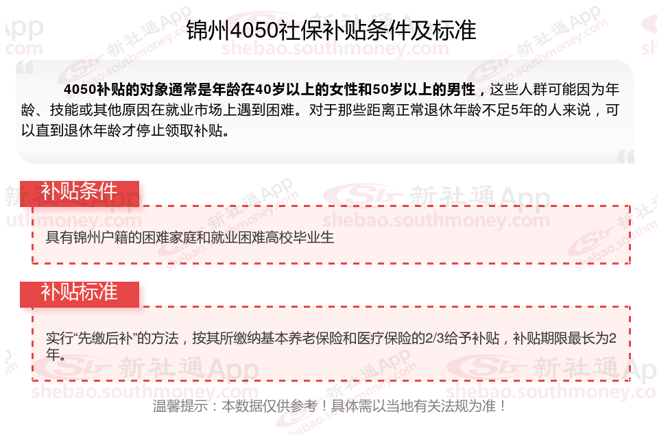 锦州4050社保补贴多少钱一个月?锦州4050社保补贴2025年最新标准是多少?2025锦州4050补贴主要针对的是年龄在40岁以上的女性和50岁以上的男性,这些人群通常因为年龄较大而面临就业困难。