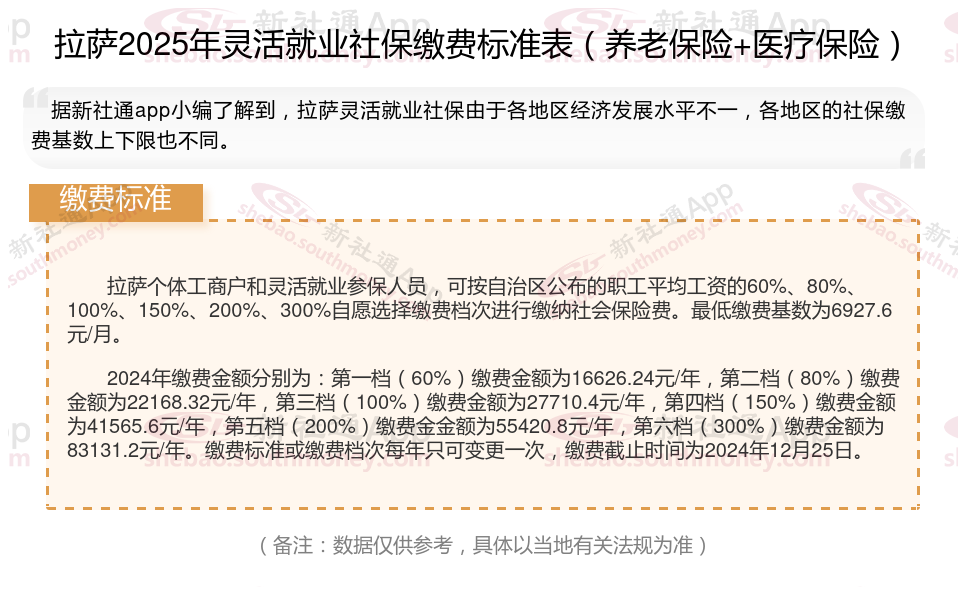 拉萨灵活就业人员社保缴费标准来了 拉萨灵活就业人员缴费多少钱怎么查?根据新社通app-社保缴费查询工具提供的2025社保缴费标准详情数据如下: