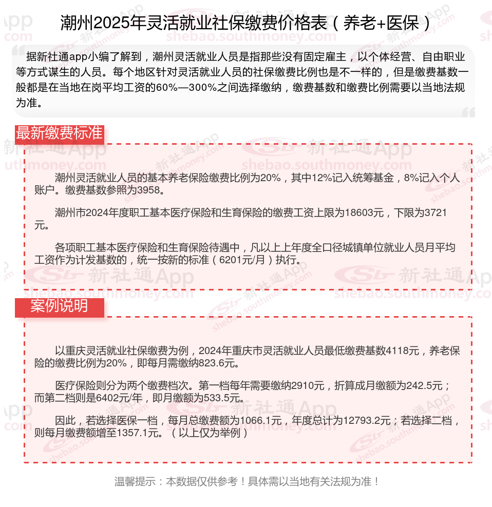 那么,潮州灵活就业人员社保交多少钱?买根据新社通app-社保缴费查询工具提供的2025社保缴费标准详情数据: