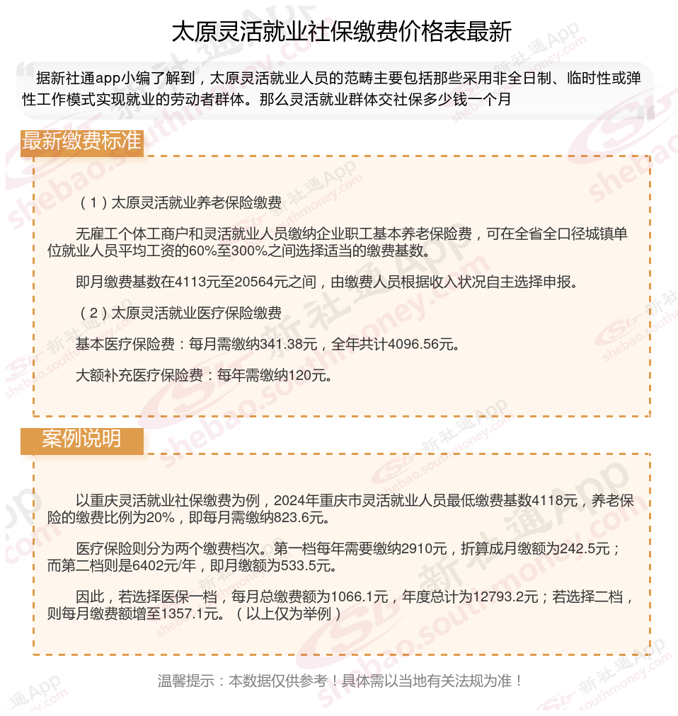 太原灵活就业社保缴费标准来了 灵活就业人员保险一个月交多少钱?根据新社通app-社保缴费查询工具提供的最新数据如下: