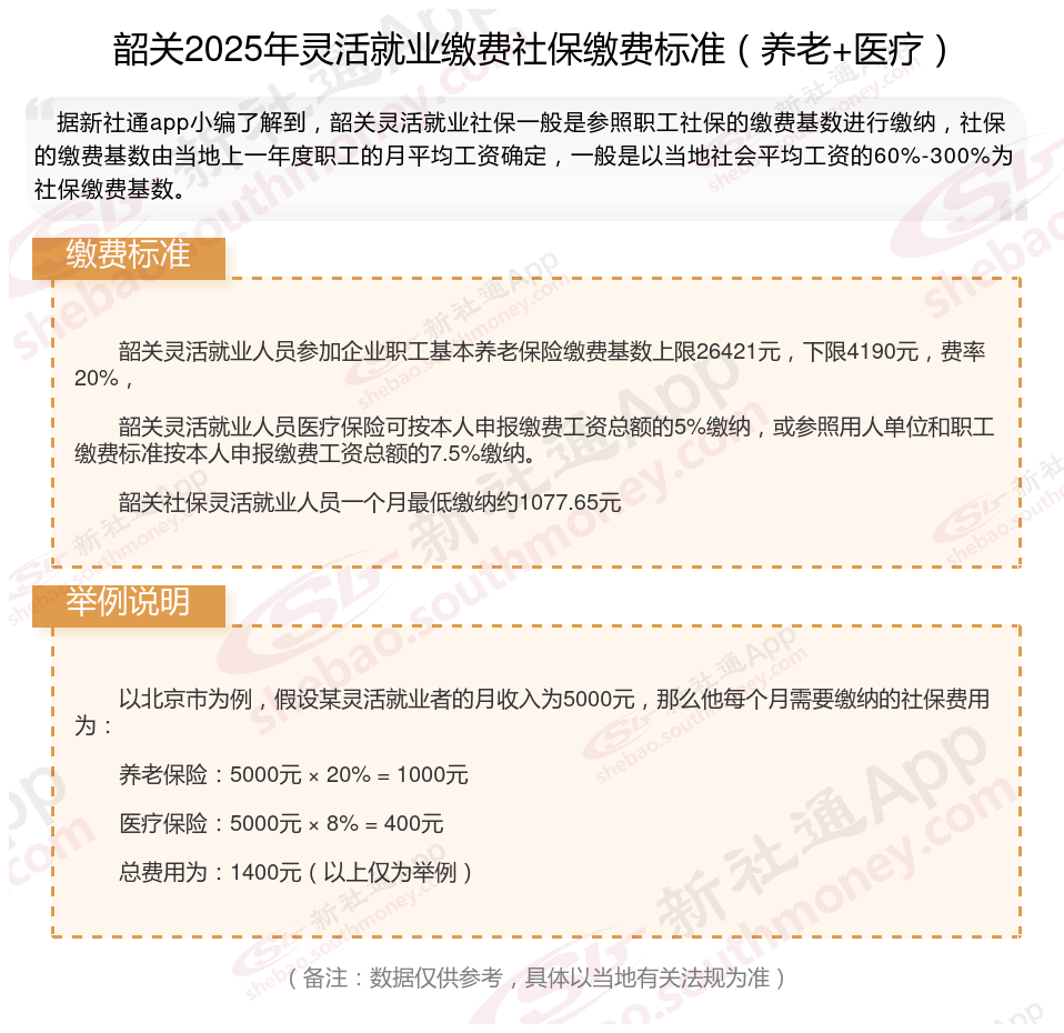 2025灵活就业社保缴费标准的调整,既体现了法规的连续性,又适应了经济社会发展的要求。灵活就业人员应根据自身情况,合理选择缴费基数和缴费比例,确保自身权益得到充分保证。那么2025年韶关灵活就业人员社保需要交多少钱?下面随新社通小编一起来看看。