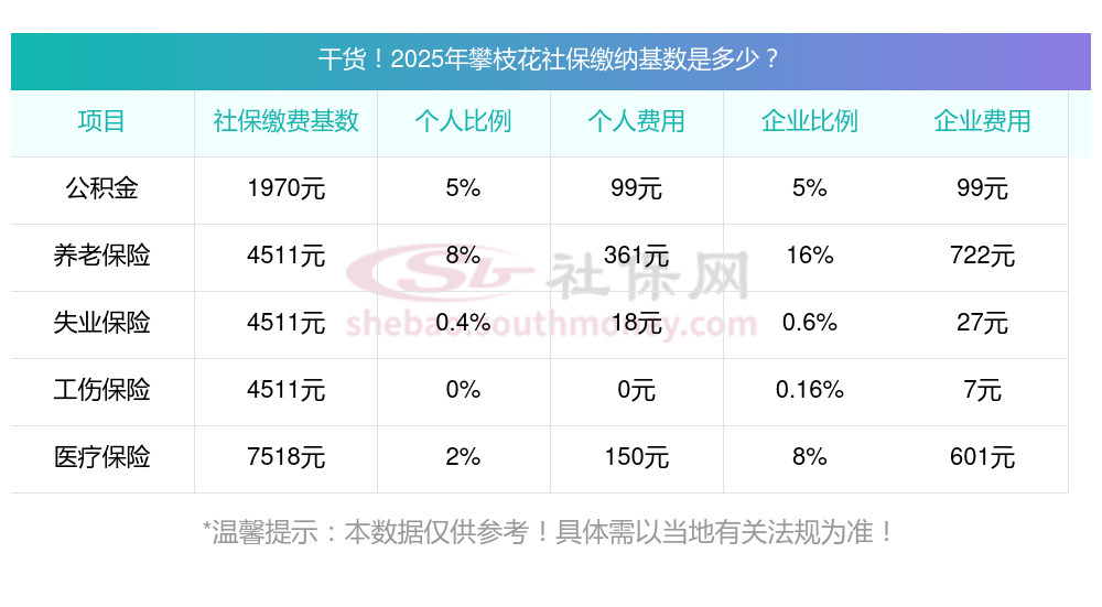 (1)据新社通小编了解到,社保缴费基数的确立,以职工上一年度月平均工资为主要依据,在此基础上结合当地社会平均工资60%-300%的上下限进行调整。 目前,攀枝花社保缴费基数为:4511.00,个人费用约为:360.88元,企业费用约为:721.76元。