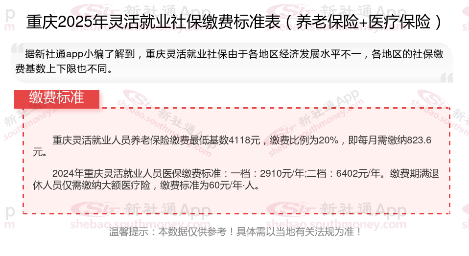 以上就是重庆灵活就业社保缴费的全部内容,数据及内容供参考!希望对你有帮助,欢迎关注新社通解锁更多社保专业资讯。