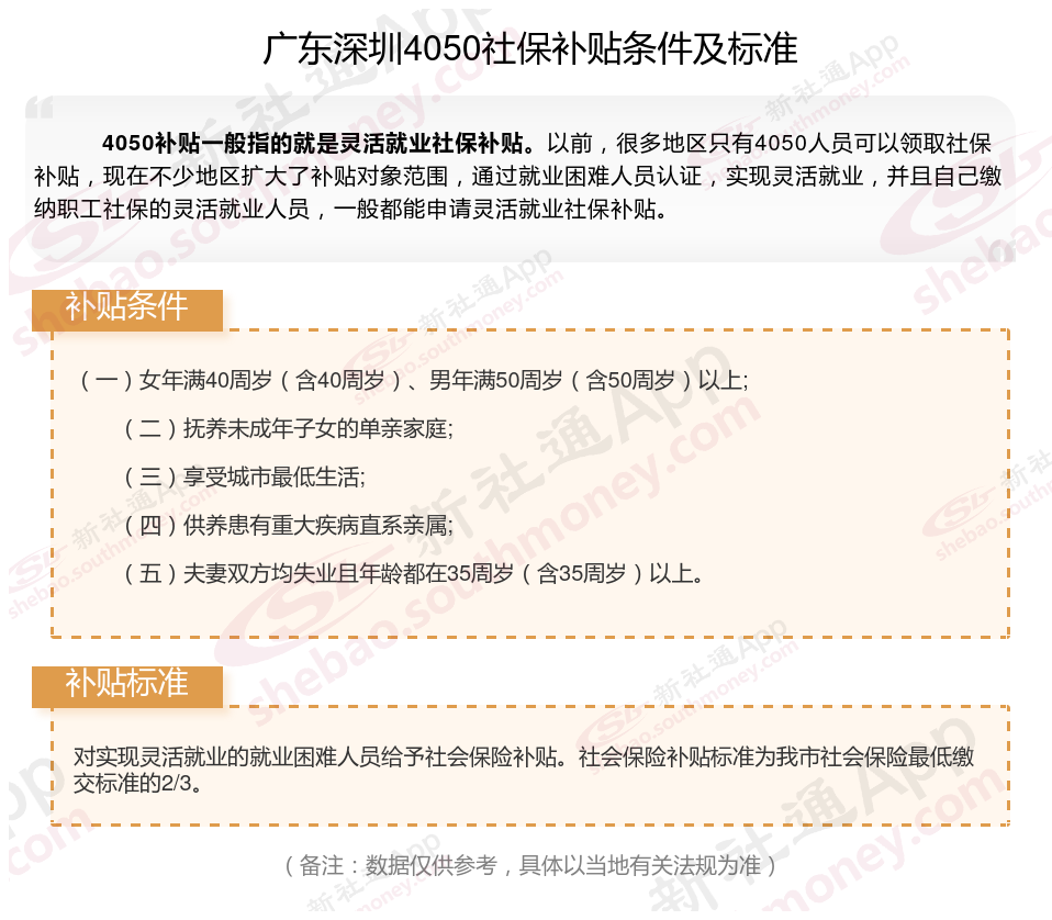 广东深圳申请4050补贴需要什么条件,申请4050补贴所需材料有哪些?2025社保补贴来了,每月可多领钱!符合4050补贴享受资格的对象,年龄需满足女性年满40周岁,男性年满50周岁的条件。