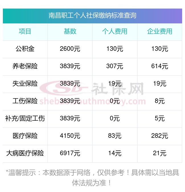 目前该南昌社保缴费基数最新参考为3579.00。(数据仅供参考)
