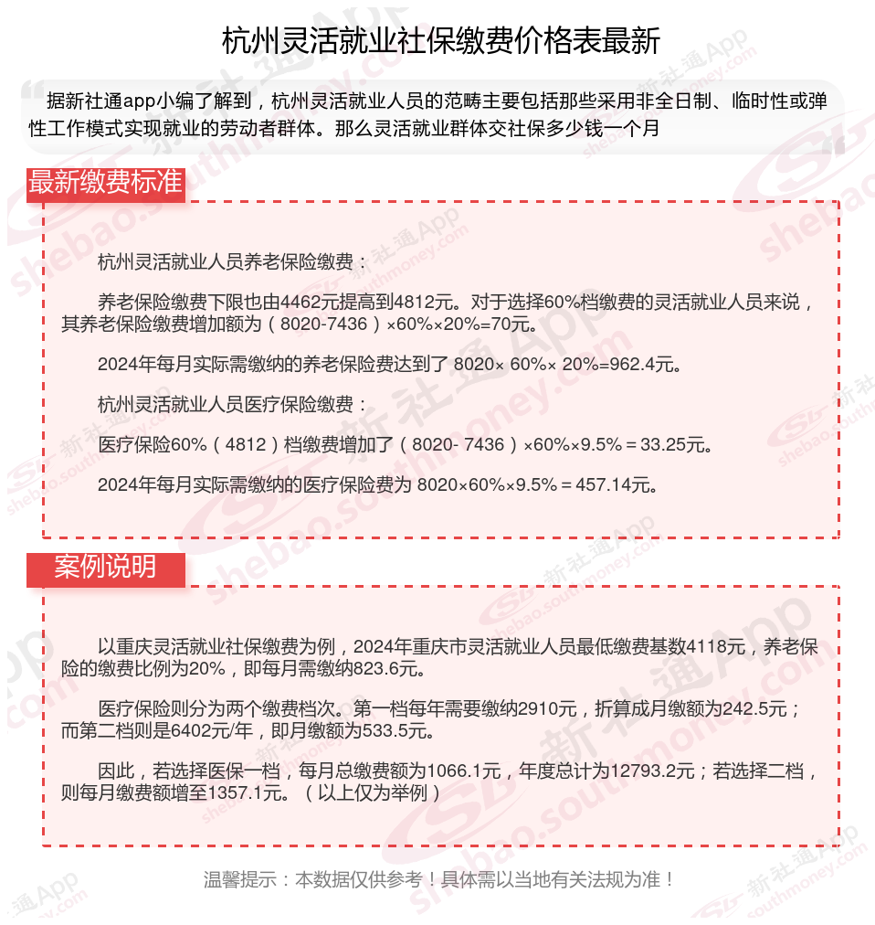 一、2024年杭州灵活就业社保缴费标准表 杭州灵活就业社保多少钱一个月?