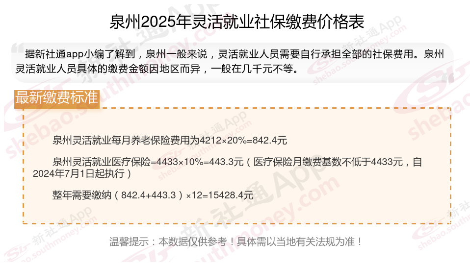 据新社通app数据显示,泉州灵活就业养老保险的缴费基数为:4212元。灵活就业人员参保缴费的比例为个人20%。