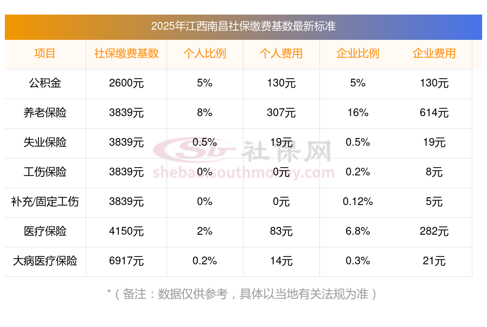 (1)据新社通app-查阅了解到,社保基数是根据职工上一年1月至12月所有工资性收入所得的月平均额而定,其用于计算缴纳社会保险费的工资基数。 目前该江西南昌社保的缴费基数为:3839.00,个人费用约为:307.12元,企业费用约为:614.24元。