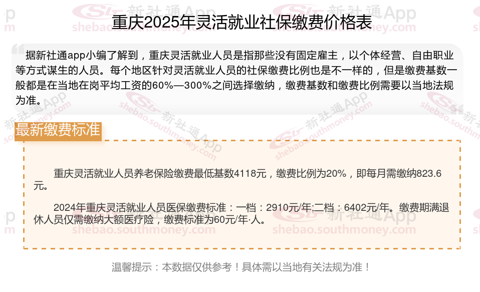 重庆灵活就业人员养老保险缴费最低基数4118元,缴费比例为20%,即每月需缴纳823.6元。