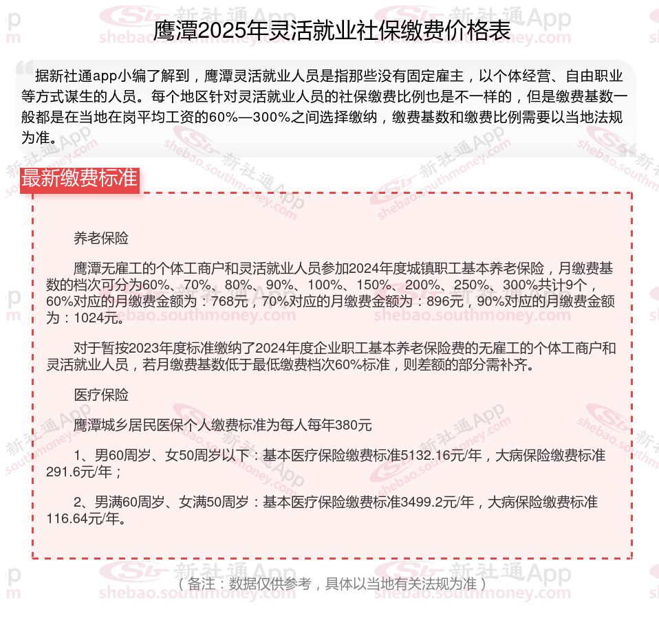 据新社通app数据显示,鹰潭灵活就业人员养老缴费基数2024-2025年最新标准如下: