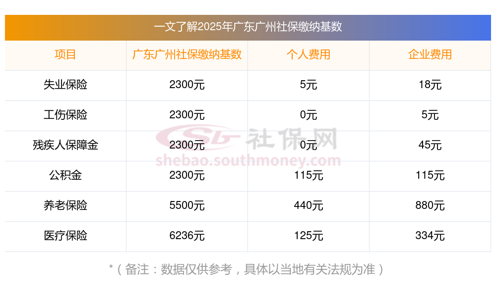 2025年广东广州社保缴费基数是多少?据新社通小编了解到,社保缴费基数主要根据职工上一年度月平均工资来确定,随后结合当地社会平均工资上下限(60%-300%)进行调整。 目前,广东广州社保缴费基数为:5500.00,个人费用约为:440元,企业费用约为:880元。