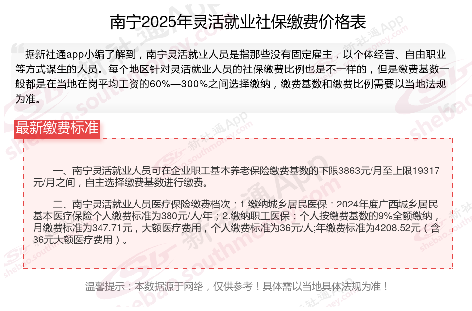 据新社通app数据显示,南宁灵活就业养老保险缴费基数2024-2025年最新标准如下: