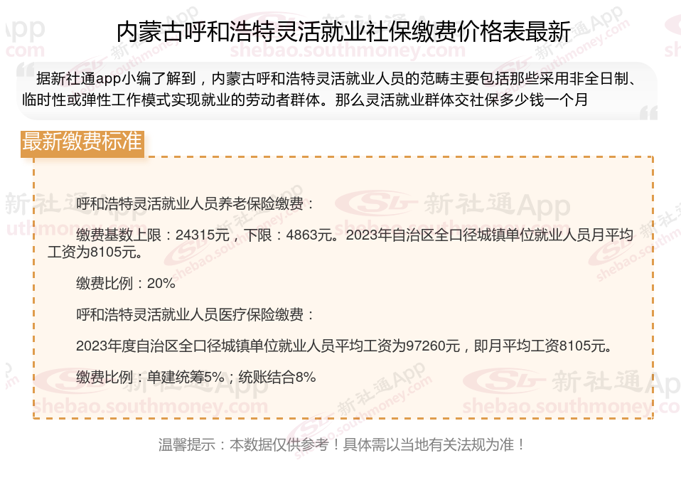以上就是带来内蒙古呼和浩特灵活就业社保缴费标准相关知识,内容及数据仅供参考,希望对你有帮助,欢迎关注/下载新社通app解锁更多社保专业资讯。