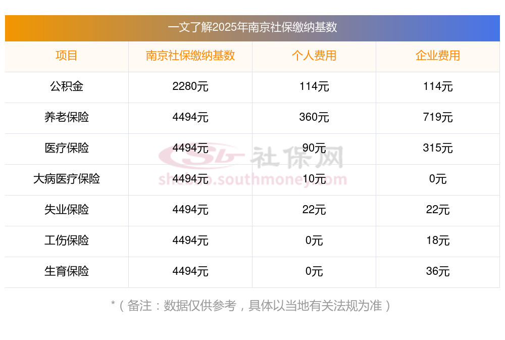 一、据新社通小编了解到,社保缴费基数的确立,主要借助职工上一年度月平均工资,再结合当地社会平均工资60%-300%的上下限进行调整。 目前,南京社保缴费基数为:4494.00,个人费用约为:359.52元,企业费用约为:719.04元。