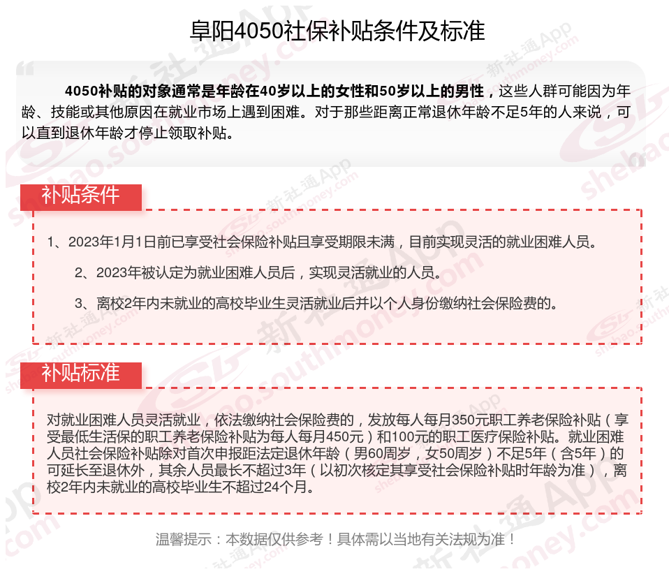 2025阜阳4050补贴主要针对的是年龄在40岁以上的女性和50岁以上的男性,这些人群通常因为年龄较大而面临就业困难。