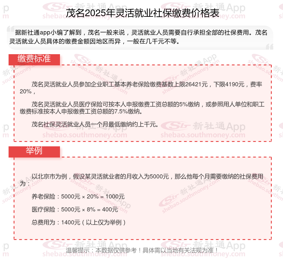 据新社通app数据显示,2024-2025年茂名灵活就业人员养老保险的缴费标准: