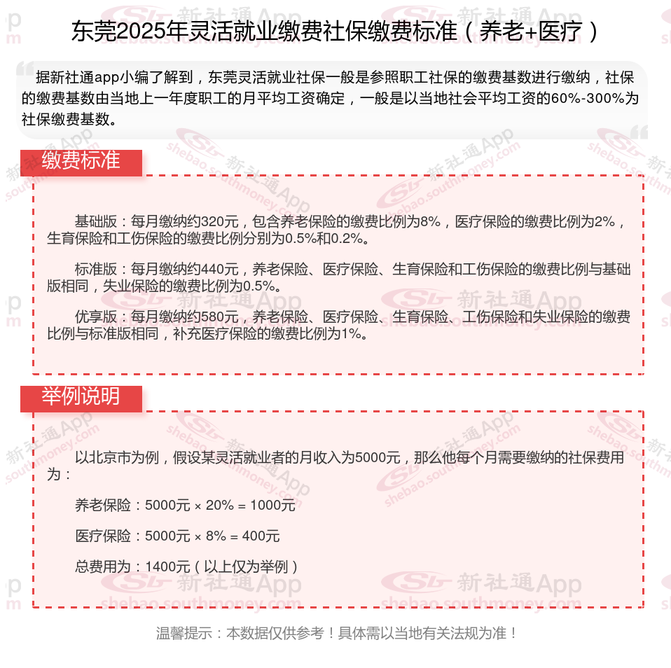 东莞灵活就业社保缴费价格表 2024-2025年东莞灵活就业养老、医保缴费标准一览表,下表是2024-2025年东莞社保费用明细参考,根据新社通app-社保缴费查询工具提供的最新数据如下:
