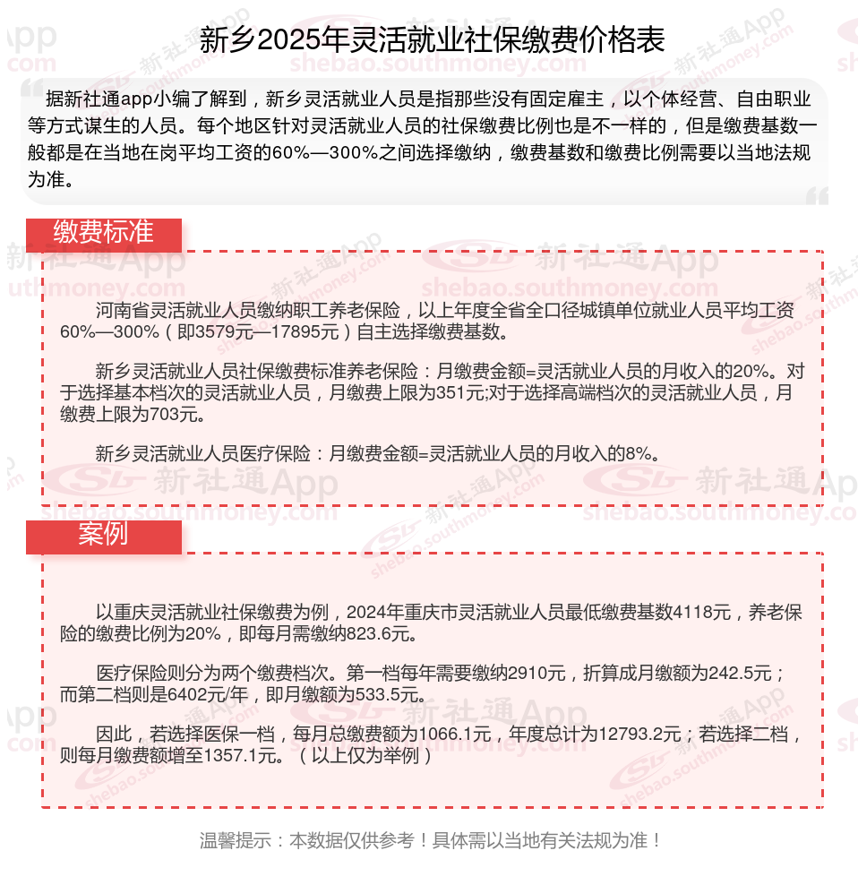 以上就是带来新乡灵活就业社保缴费标准相关知识,内容及数据仅供参考,希望对你有帮助,欢迎关注/下载新社通app解锁更多社保专业资讯。