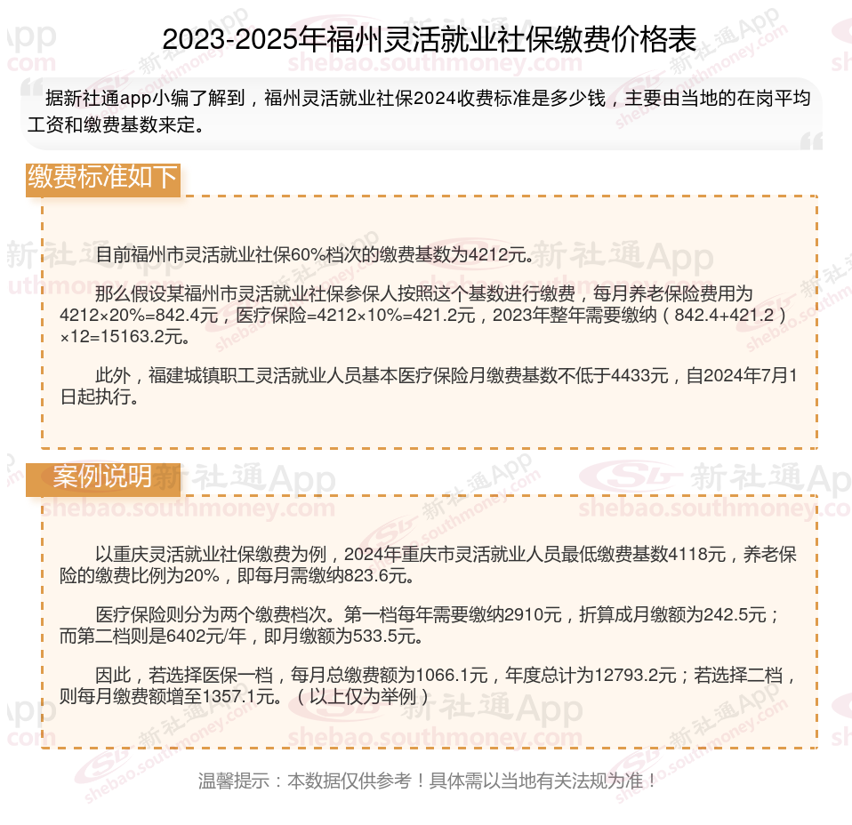 灵活就业社保缴费价格表来了!2024-2025年福州灵活就业人员社保需要缴费多少钱一个月?根据新社通app-社保缴费查询工具提供的最新数据如下: