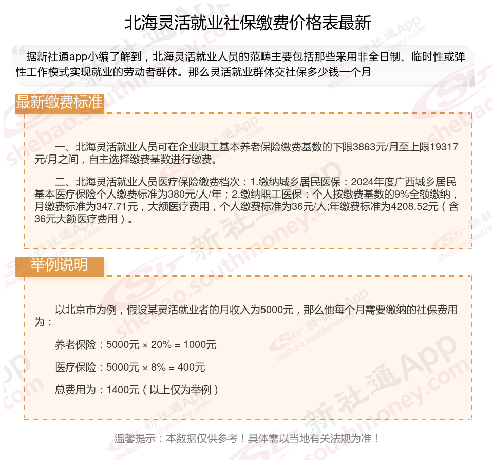 那么,北海灵活就业社保缴费标准是多少?自由职业者社保,要交多少钱一个月?根据新社通app-社保缴费查询工具提供的2025社保缴费标准详情数据: