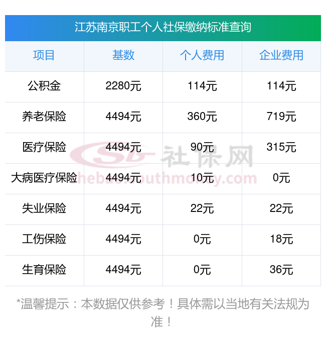 江苏南京缴费社保比例一览社保公司和个人各交多少?下表是2024-2025年江苏南京社保费用明细参考,新社通app-社保缴费查询工具提供的最新数据如下:
