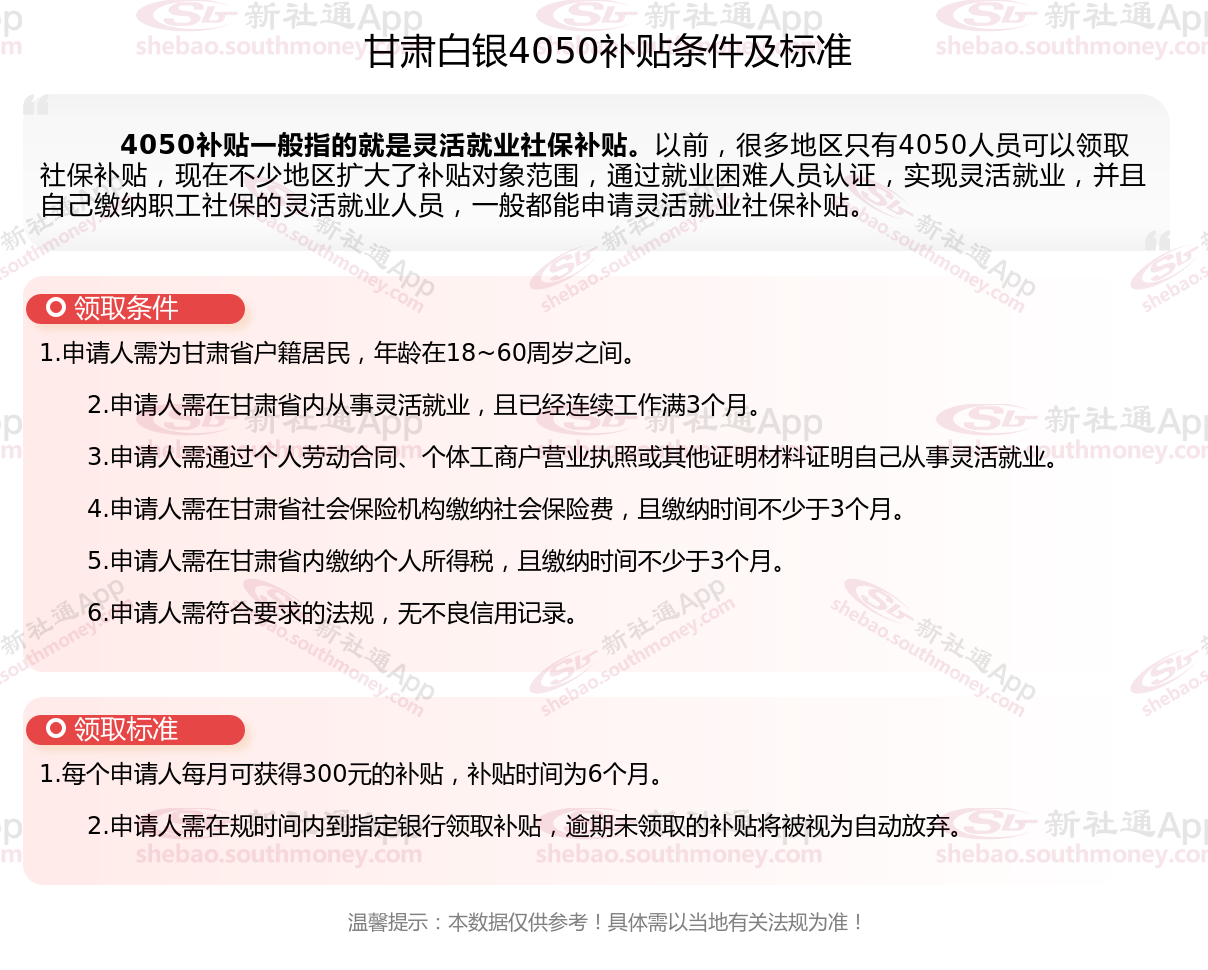 甘肃白银申请4050补贴需要什么条件,申请4050补贴所需材料有哪些?2025社保补贴来了,每月可多领钱!4050补贴享受对象的年龄限制为:女性年满40周岁,男性年满50周岁。