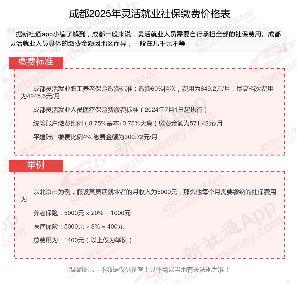 灵活就业社保通常只需缴纳养老和医疗两项(部分地区可自愿选缴失业险),其他险种无需强制缴纳。灵活就业社保缴费满15年后,退休后可领取养老金,避免老年无收入来源。那么2025年成都灵活就业人员社保需要交多少钱?下面随新社通小编一起来看看。
