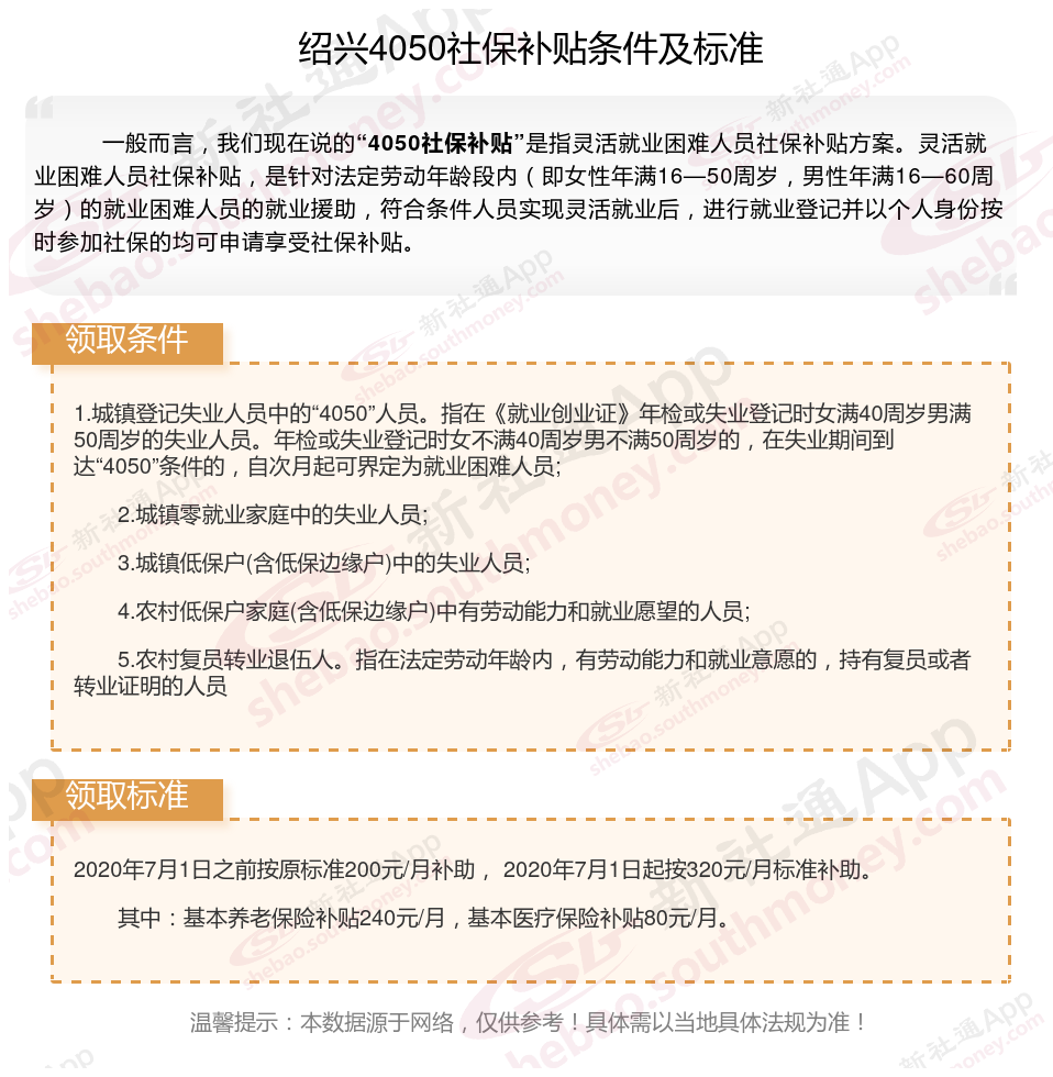 第一、绍兴社保4050补贴标准咋样?2025年绍兴4050补贴可以领多少钱?绍兴想领取4050补贴,主要有以下这些领取条件