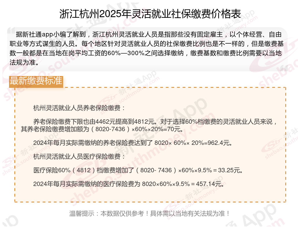 那么,浙江杭州2024-2025年社保缴费基数下限确定,浙江杭州2025年社保最低缴费明细来了,根据新社通app-社保缴费查询工具提供的2025社保缴费标准详情数据: