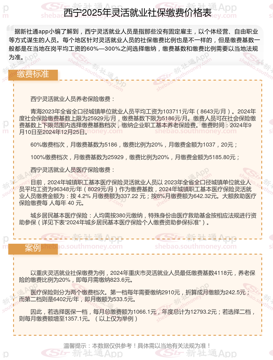 西宁灵活就业社保缴费价格表 2024-2025年西宁灵活就业养老、医保缴费标准一览表,下表是2024-2025年西宁社保费用明细参考,根据新社通app-社保缴费查询工具提供的最新数据如下: