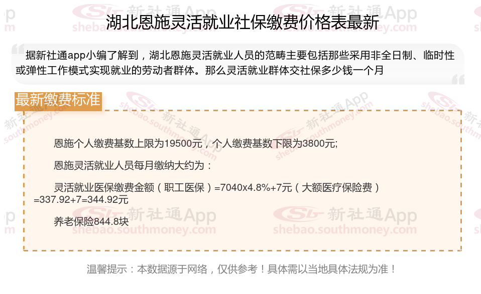 据新社通app数据显示,湖北恩施灵活就业人员养老保险缴费基数2024-2025年最新标准如下: